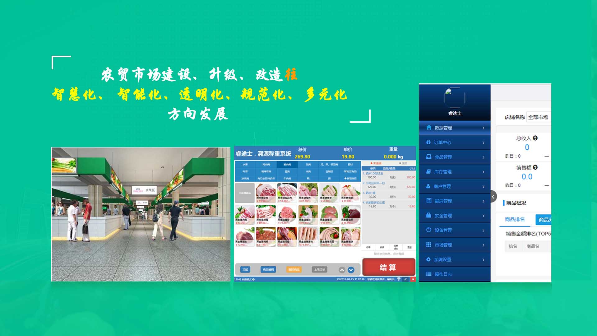 睿途士顛覆傳統(tǒng)的智慧農(nóng)貿(mào)溯源系統(tǒng),創(chuàng)新實現(xiàn)了【智慧農(nóng)貿(mào)溯源管理系統(tǒng)】與【智能稱重收銀】 一體化解決方案,集市場監(jiān)管、市場管理、運營管理、智能收銀、 溯源追溯、線上買菜、大數(shù)據(jù)運用于一體,硬件、軟件與管理系統(tǒng)完美結(jié)合。